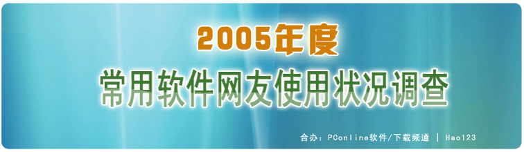 编者按:时光如梭,转眼间就到了2005年的最后一个月,在这一年里软件界呈现百花争妍的状况,不断有新的软件进入大家的视线,也有些永远地退出了历史的舞台,成为一个光辉的印记。 业界是不断前进的,而你的软件使用习惯有没有随着改变?你最常用的软件工具是哪些?在这里,小编诚恳地邀请您参加太平洋电脑网与Hao123合作开展的《2005年度常用软件网友使用状况调查》,写下属于自己的意见。 调查时间:2005年12月10日~2006年1月10日